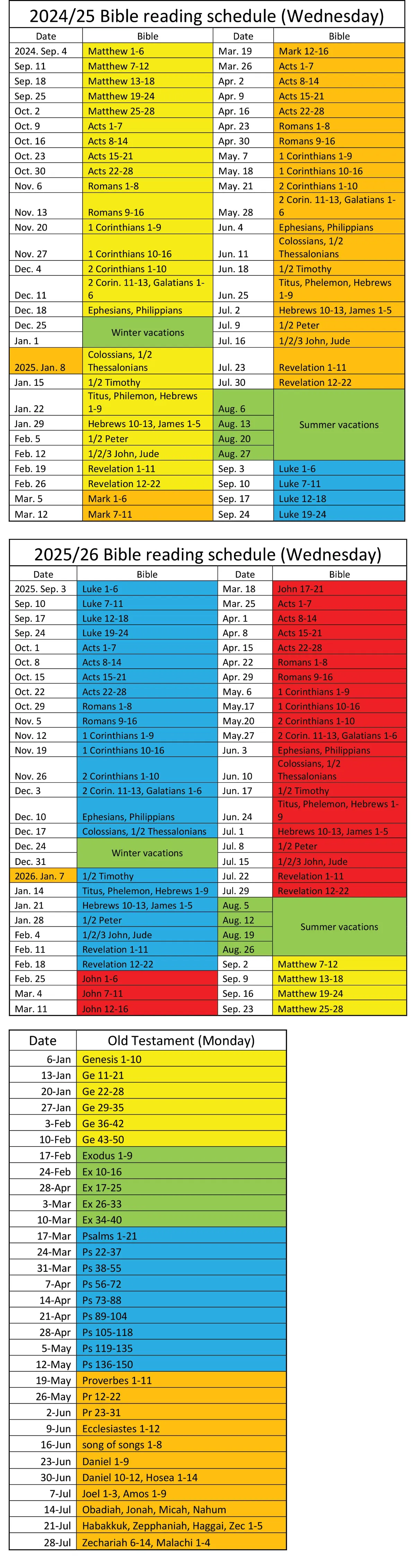 - First goal: For a new group, it is good to aim to complete one reading of the New Testament (Korean, English NIV, French). We recommend reading the Bible twice in one year, and four times in two years. Breaks are important: four weeks in August and two weeks in December. After finishing the New Testament, if participants want to read the Old Testament, the group can divide into one reading the Old Testament and another continuing the New Testament. The scope of the Old Testament reading can be set appropriately.