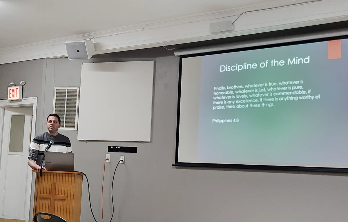 The first presentation was delivered by Andrew Roberts, who spoke on the "Discipline of the Mind." Andrew opened by reflecting on the purpose of the mind and God's design for it — that Christ would be at its very center. He went on to highlight a challenge that every Christian man faces: the difficulty of maintaining a truly Christian mind in a world of ever-increasing technological complexity. The constant noise and distraction of modern life, he noted, can quietly erode spiritual growth without men even realizing it. His call to action was clear — as men of God, we must be intentional and deliberate about undergoing a divine renewing of our minds.